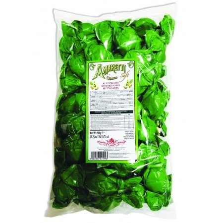 Amaretti (macarons) tendre goût pistache. Individuellement enveloppés et emballés dans du élégant papier coloré. Sans gluten.