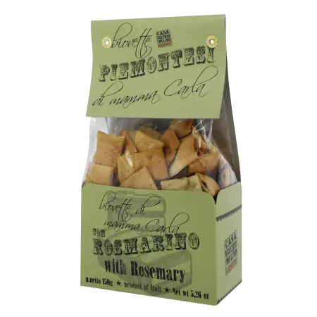 Fabriquées artisanalement dans la province de Turin, ces biscuits apéritifs offrent une saveur subtile et aromatique grâce à l’utilisation de romarin frais et d’ingrédients naturels.